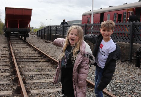 Two children stand on a railway track pointing at a freight. In the background is a passenger carriage